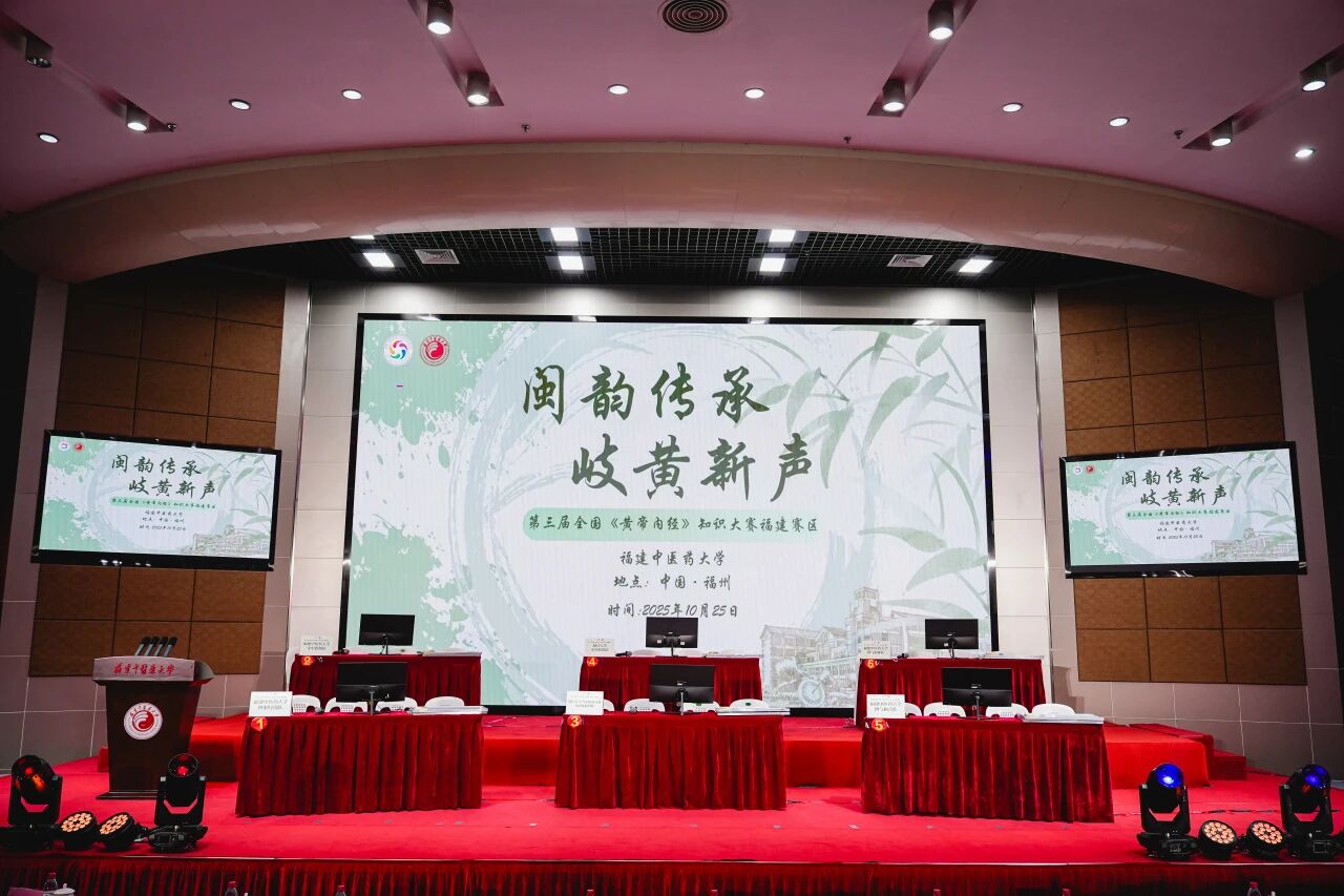 2025年10月25日下午,第三届全国《黄帝内经》知识大赛福建省赛区现场赛在福建中医药大学旗山学术报告厅隆 重举行。本次大赛吸引了来自福建中医药大学、厦门大学及厦门大学马来西亚分校中医学院的六支优秀队伍同台竞技,共溯岐黄之源,同论医经之奥,充分展现了当代中医药学子深厚的经典素养与昂扬的精神风貌。